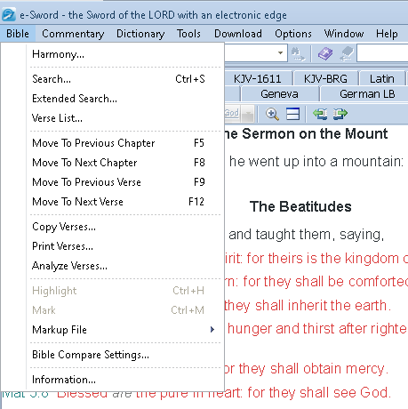 There are several Greek words for ‘poor’ in the New Testament. Let us use the e-Sword programme to see this so that we can determine the proper meaning of Mat 5:3. Open your e-Sword programme and then open the Bible search window, which you can do in two different ways – 1. clicking on the Bible menu at the top opens a dropdown menu and then click on the word Search; 2. the dropdown menu also shows you a shortcut to do this quickly by pressing the Control and the letter S on your keyboard at the same time.