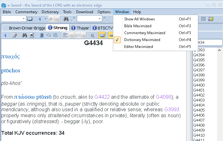 Remove the Bible search window and let us now go back to Mat 5:3. This time click on the KJV+ tab and all the Strong’s Numbers appear in the whole chapter. You can see that the word we want to study has G4434 beside it. You can hover over it but the pop-up gives only a short amount of information, sometimes all you need, but it is better to look at it properly.