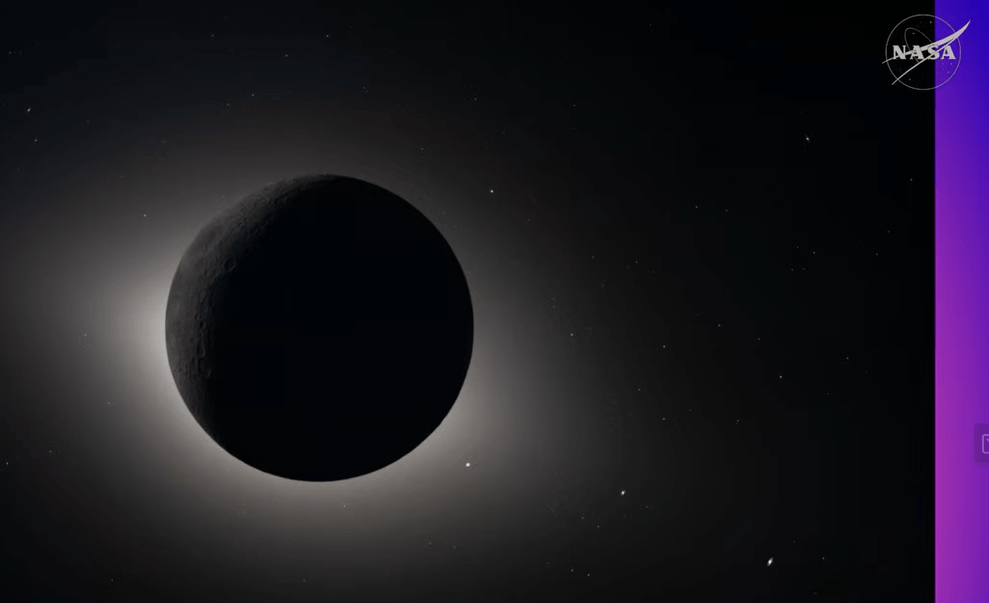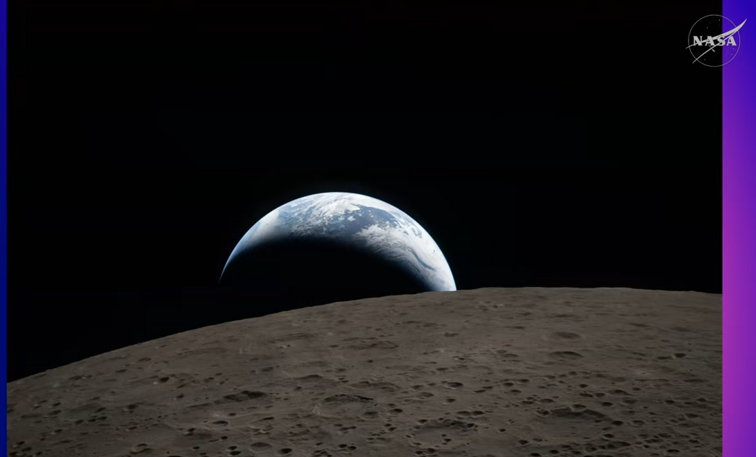 On its return from the Moon to Earth, Orion experienced the first Solar eclipse seen from the Moon, lasting 54 minutes of totality because the Moon is so close and appears so much larger than the Sun. This photograph shows Earthshine on the Moon. The Sun’s light reflects off the Earth, which the crew reported as very bright, and reflects back to the Moon so that a crescent of light can be seen on the Moon, which is not completely black because of this Earthshine, described as “amazing” by the crew. They could see “the majority of the surface of the Moon” because of this Earthshine.