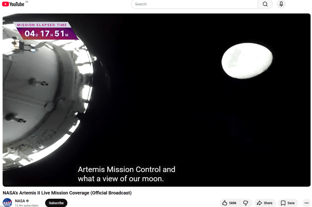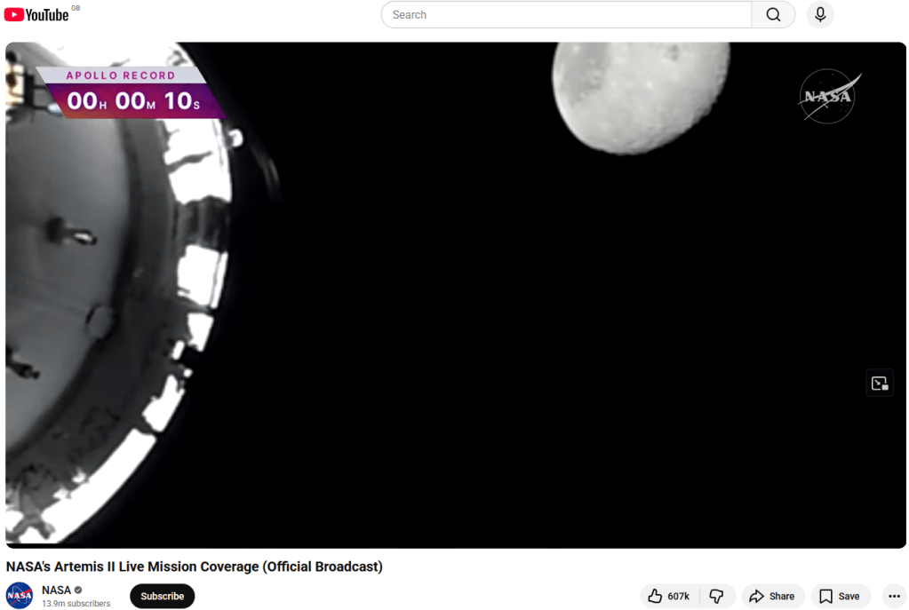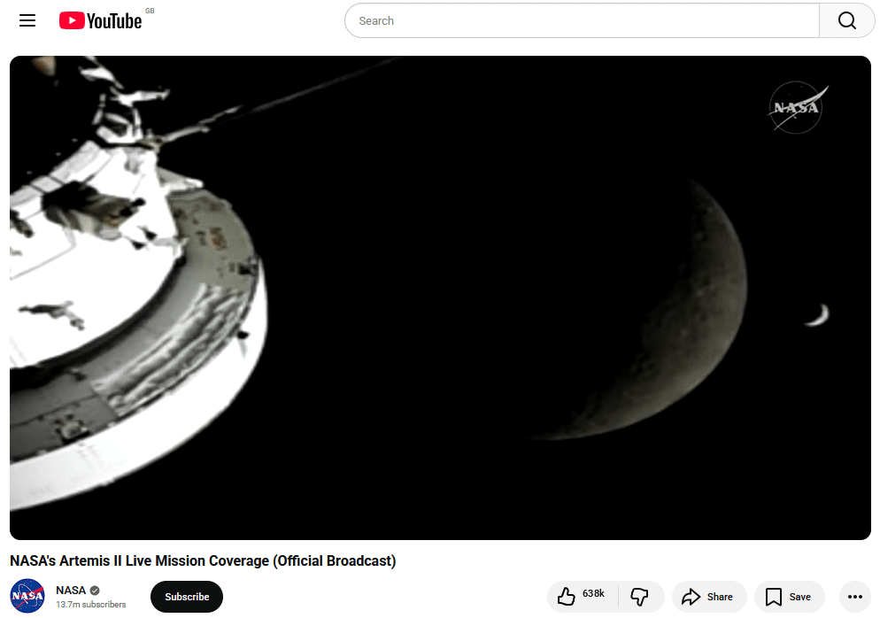 Current live streaming. 6 Apr 2026: 2:13 p.m. BST 22,000 miles away from the Moon. 3:37 p.m. 19,000 miles from the Moon.